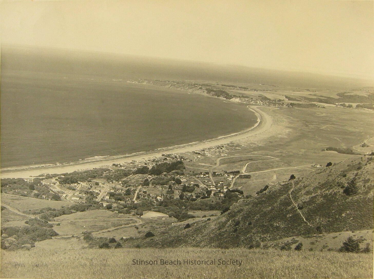 Westerly overview from mountain side with Stinson Beach below, Bolinas and Duxbury Reef stretching into the distance. Downtown identifiable buildings are Airey's Store and some houses in the Highlands. Buildings in present park, Sea Downs, Dipsea Lodge, old library and others occupied by military (perhaps) are also identifiable. See notes.Collection