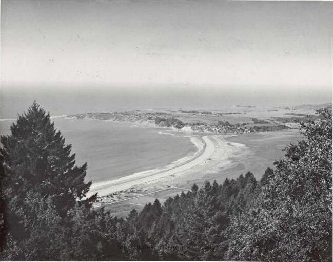 Black and white photograph of panoramic view of Stinson Beach showing the Patios, Sandspit (Seadrift) and Bolinas Bay. It also shows the causeway to the sandspit. There are houses on the Patios and the first house on the spit-Jeffers. There are trees in the foreground and the town of Bolinas is seen across from the end of the sandspit with Bolinas Point and Bolinas Mesa in the background. The horizon is hazy.Collection