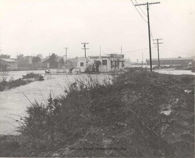 This black and white photograph of flood waters from the 1956 storm shows damage in the Calles and to buildings. One person is at fence near Elwood's. Debris is piled in foreground.Collection