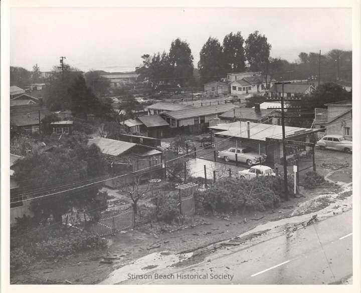This black and white photograph, taken from Sea Beach Hotel looking across Highway 1, shows downtown area after the 1956 flood. Structures from L to R are: Kurtz's Cottages, Ruth Miller Real Estate, and side of the Seaside Restaurant. See notes.Collection
