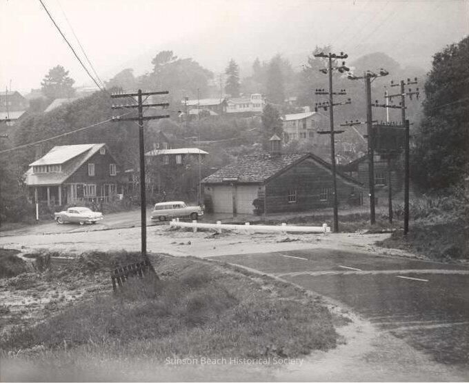 This black and white picture is of Easkoot Creek flooding. The bridge on Hwy. 1 is covered with water. There are buildings behind the swollen creek next to Highway 1 and on the hillside behind. The building on the right with the two large garage doors is the firehouse. Two cars are parked nearby. There are four telephone poles beside the highway on the near side of the creek.Collection