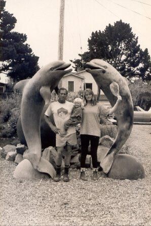 In this black and white photograph artist/sculptor Peter Bishop Allen with his child Molly on his hip and his wife Desiree Mann Allen beside him, stand between two of his giant sculptures of dolphins which arch up over their heads. Molly is a tow-headed little girl and Desiree holds something in her hand that looks like a paddle.Collection