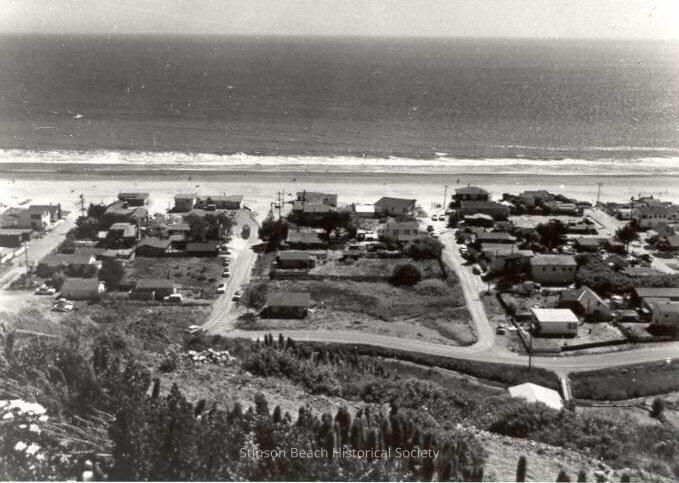 This black and white photographic print is an overview (L to R) of Calles Onda, Resaca, Ribera and Embarcardero in the 1970s.The ocean is in the background, Calle del Arroyo in the foreground.There are houses along Onda, Resaca, and Ribera.Collection