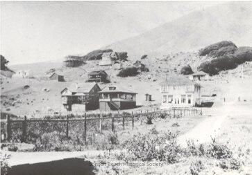 A black and white photo of houses on the hill at Stinson Beach. The white building at the lower right is the Airey Hotel. The house above it and slightly to the right is the Kaltoff house. The two lower houses to the left of Airey's are, from left to right, the Fitzhenry and the Hensil houses. Above and between those 2 is the De Camp house and to it's left is the Courtland barn and house. Above the barn and slightly to the right is the Upton house (under construction) and to it's right is the Chambers house. The house below and to the right of the Chambers house is unidentified. (See 1993-238-#2 for I.D. Key)