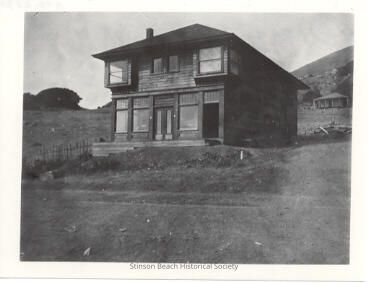 An original black and white photograph of Airey Store built 1906. On the back of the photo written, "Built by Upton, Bought(Bo't) by H.J. Airey & wife. Airey's Store 1907circa. L.Airey" The building stands on an open field, in distance, there is a house with a covered front porch. A clump of bay tree to left hill. See notes.Collection