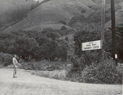 This black and white photograph shows a man (Will Airey) standing on a gravel road (Belvedere Ave), looking at future site of the community center. There is a sign that reads " Site of Stinson Beach Community Center". The land was donated by Stinson family and is bare except for some trees and bushes.Collection