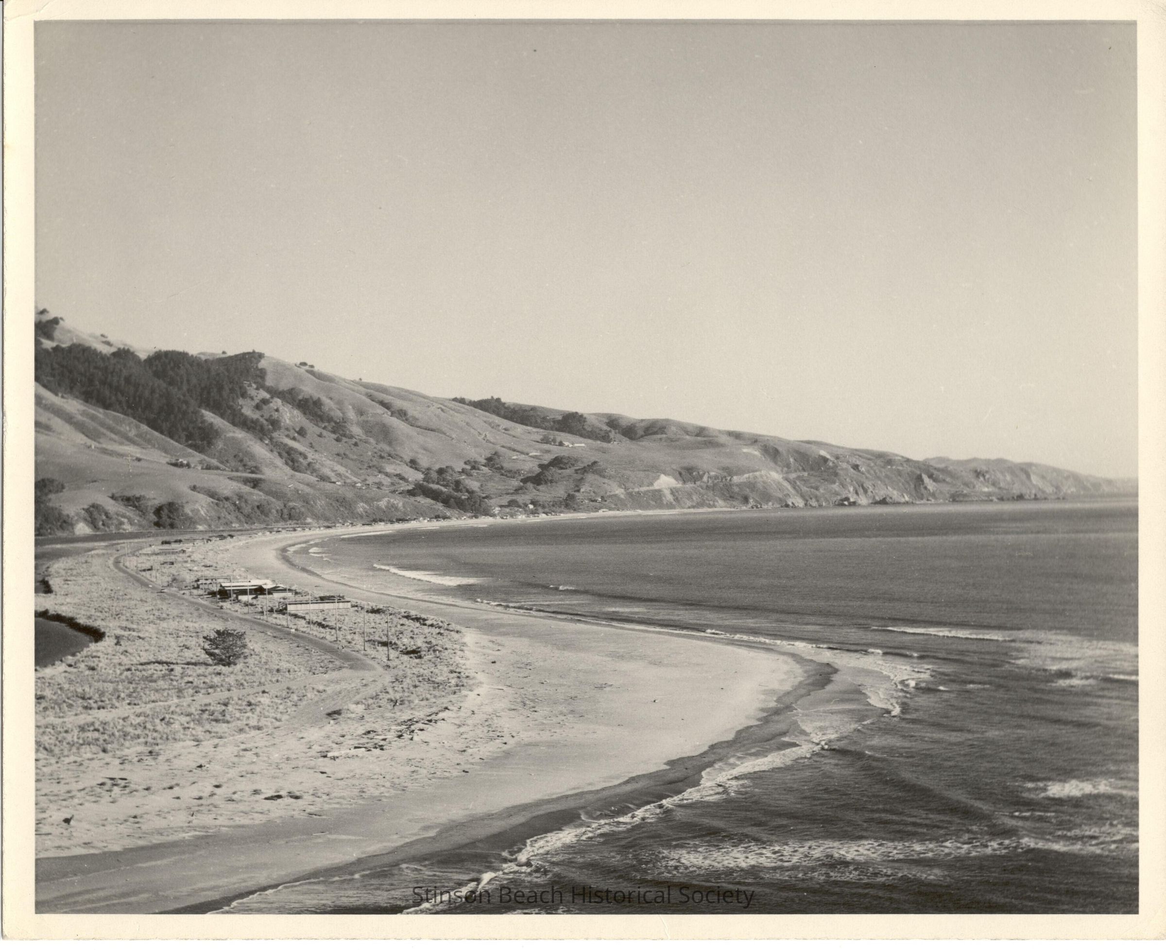 This black and white photograph is of the sandspit looking toward town of Stinson Beach from Bolinas. There is one road running past the first several houses in Seadrift and poles are standing to indicate corners of lots. The begining of Seadrift Lagoon is shown to the left edge of the photo. The entire sweep of the beach is shown with the hills in the background. See notes.Collection