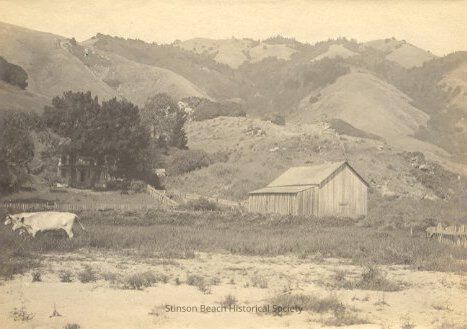 The photograph shows Capt. A.D. Easkoot's house built in 1883 under pine trees to left, barn to right, two cows in front field, grape stake fence to right of the field which continues up the hill from the back of the barn. In background are Stinson Beach hills without any structures. Another fence runs in front of the house at the approximate location of present Highway 1, which did not exist then. The house was burned in 1976 and rebuilt since with a similar structure attached to the back.Collection