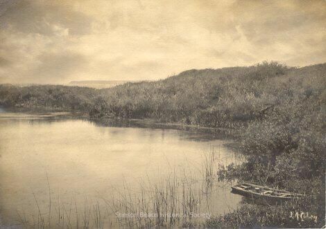 6 1/2 x 4 1/2 in size, written on back by Cohen, "Willow Camp Lake and Duxbury Point #1616" Stamped, PHOTOGRAPH, space, EDGAR A, COHEN, Alameda, Cal. Signed on front lower right, E.A.Cohen. An original black and white photograph of Willow Camp Lake (aka. Poison Lake), surrounded by willows, with a wooden row boat at lower right, Duxbury point shown in distance, stormy sky.Collection