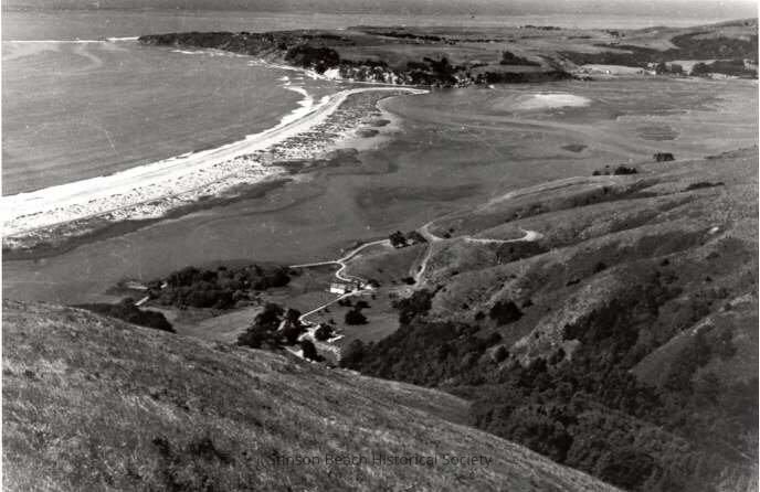 This is a black and white photograph taken from high on a steep hill. It looks down on a gully with some buildings and roads winding up the hillside and, beyond, a sandspit dividing a lagoon on one side and the ocean, with breakers, on the other. Beyond the sandspit a peninsula juts out into the ocean. It is a view of Bolinas Bay, Bolinas Lagoon, the undeveloped sandspit and Stinson Ranch in Stinson Gulch.Collection