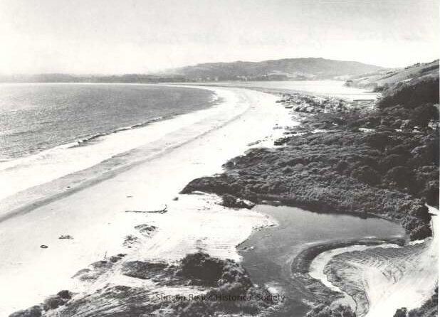 This is a black and white panoramic view of Stinson Beach with Bolinas ridge and peninsula beyond and Willow Camp Lake being filled in to create the south parking lot for the California State Park. See notes.Collection