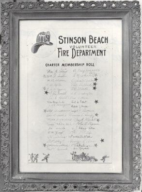 This is a black and white photographic print of the framed original poster which lists the charter membership role of the Volunteer Fire Department, part of Stinson Beach Fire Protection District. It bears the signatures of the members and some drawings.Collection