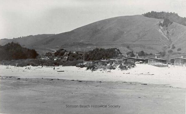 This is a black and white photo of the downtown neighborhood, taken from the beach, at Stinson Beach, Ca. The structures on the dunes are Sea Downs, on the left, and five cottages. There are several people on the sand (too small to be identified) and in the background houses are visible going up the hill.Collection