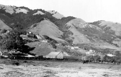 In this black and white photograph we see a barn in the foreground with a house to the left of it and houses on the hill behind. The coastal mountains are in the background. It is the Easkoot house and barn at the base of the hill. The Upton house is high on the hill to the left of the barn (see #1993-259 #2) and Airey's store is at the bottom of the hill to the right of the barn.Collection