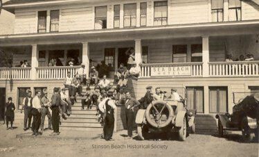 A sepia postcard showing the front steps of the Sea Beach Hotel. There are many people gathered on the hotel veranda, the steps and the street in front of the hotel. There are 2 parked cars visible.Collection