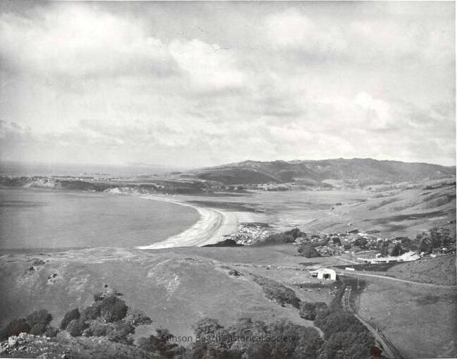 A black and white panoramic view shows Bolinas Bay, with White Gate Ranch and Panoramic Highway in the foreground; then the sandspit, Bolinas Lagoon, Bolinas Mesa, Horseshoe Hill and Point Reyes Peninsula in the background. The photograph is taken from a height and looks down on the Highlands and Old Town of Stinson Beach as well as the houses on the Bolinas Mesa.Collection