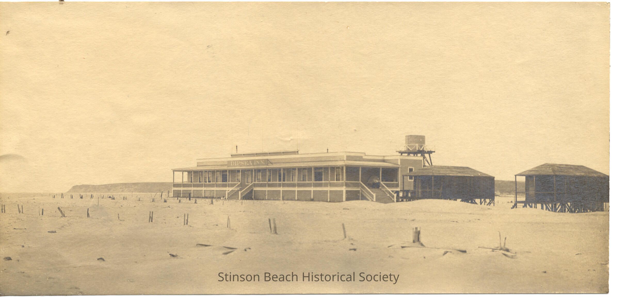 An original black and white photographic print of Dipsea Inn by Edgar A. Cohen. Shows the Dipsea Inn and 2 cottages as stood on Sandspit of Stinson Beach. Bolinas Mesa and surf in background, sandy beach with posts (Property mark?) in front. On the back: Photographs(stamped) #1828 Dipsea (written in pencil) Edgar A. Cohen, Alameda, Cal. (stamped)Collection