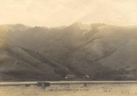 An original photograph by Edgar A. Cohen. Photograph was taken from sandspit across from the lagoon. The Belvedere Ranch in center (presently Stinson gulch, south of Stinson Beach School, where SBCWater District barn is located), the hills rising in the back. On the spit are a couple of horseless buggies, and a flat roofed structure. On the back of photo: Photographs (stamped) # 1817, Belvedere Ranch from Dipsea (penciled) Edgar A. Cohen, Alameda, Cal. (stamped)Collection
