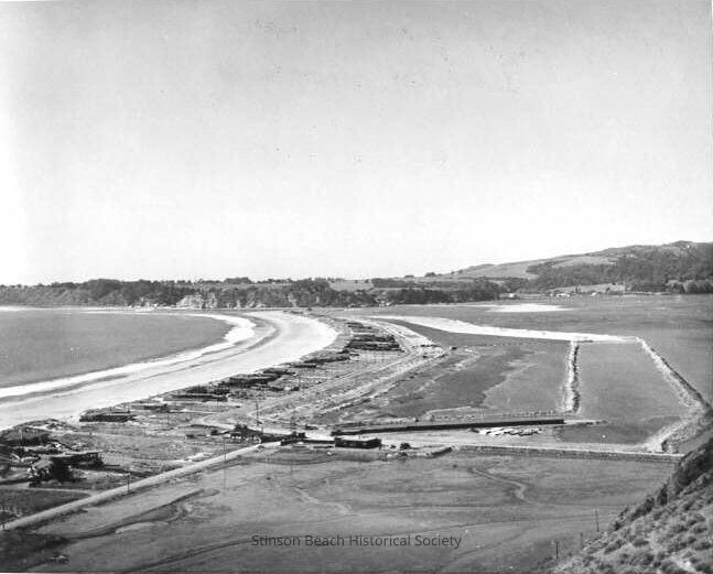 A black and white photograph of the area of Bolinas Lagoon in the process of being filled in in order to create Dipsea Rd. and the Seadrift Lagoon. Part of the causeway between Highway 1 and Seadrift is visible . See 2018-109-11 for the date reference.Collection