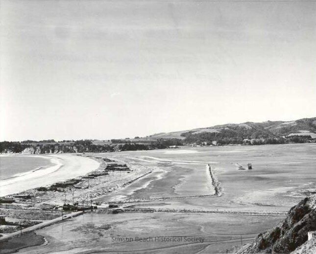 A black and white photograph of the area of Bolinas Lagoon being filled in order to create Dipsea Rd. and Seadrift Lagoon at the beginning of the project. There is a dredge in the right mid-ground. The causeway between Highway 1 and Seadrift is visible in the foreground.Collection