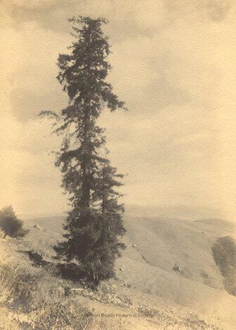 An original photographic print by Edgar A. Cohen of Lone Tree as it stood on the Dipsea Trail (Lone Tree Trail) as a trail marker on 10/14/1902. Shows Bolinas and a slice of Stinson Beach in distance. Bare hills and a smaller tree at its root. On the back: Photograph (stamped), #1455 - The Lone Tree (penciled) Edgar A. Cohen, Alameda, Cal. (stamped)Collection