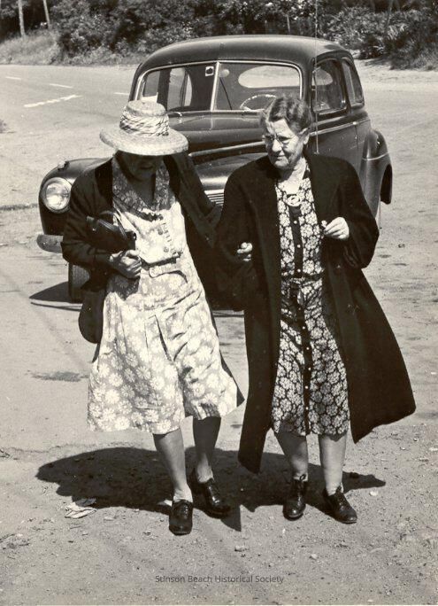 This black and white photograph is of two women (left Margaret Smith, right Elizabeth Airey) walking arm in arm. They are wearing flower print dresses under black coats. Margaret is wearing a hat. There is a car in the background.Collection
