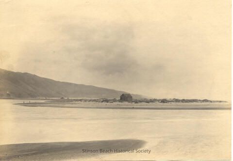An original black and white photograph by Edgar A. Cohen, of Sand Spit taken from Bolinas. On the sand spit stands a boatman's shack and a tall oat house. Dipsea Inn is in far distance. The lagoon curves around the spit beneath hills and sky with its hint of darkening clouds. In foreground, the sand bar of Bolinas juts out. On its back: 5/31/04 - 5.40PM (penciled) Photograph (stamped), #1830 Bolinas Sand Spit from road to Bolinas Wharf (penciled), Edgar A. Cohen, Alameda, Cal. (stamped)Collection