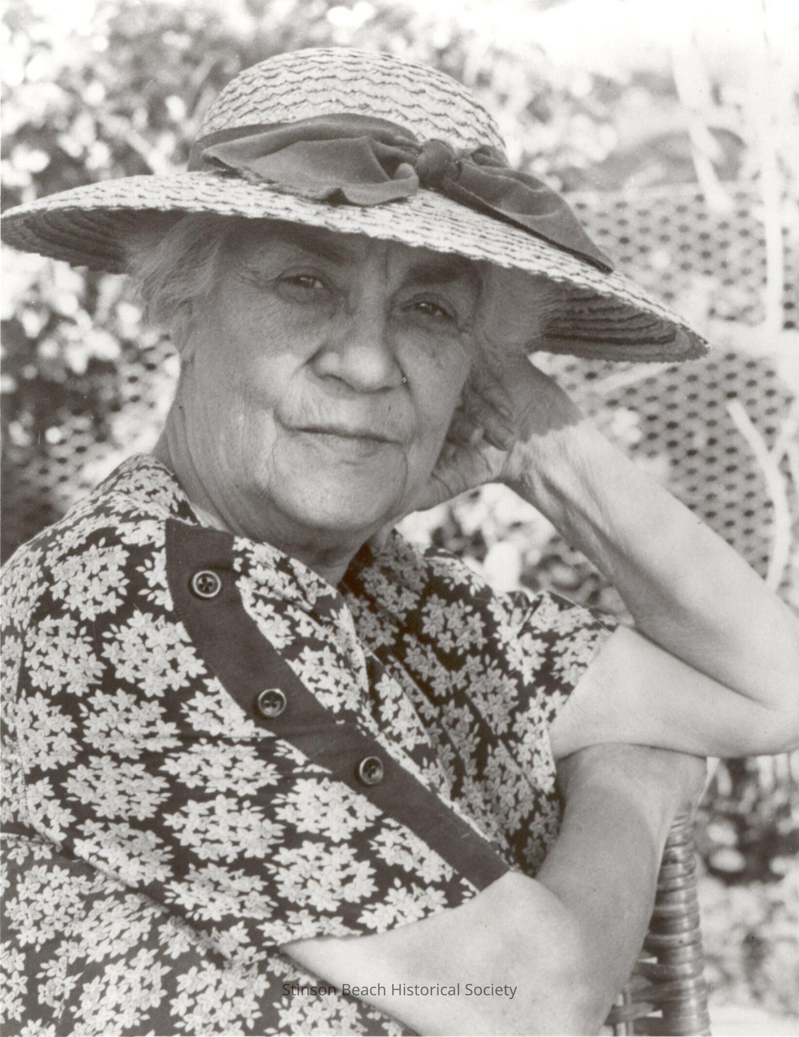 This is a black and white photograph of Margaret Worral, an early resident of Stinson Beach, Ca. She is white haired and is wearing a broad brimmed straw hat and a flowered dress. She is looking straight into the camera and has a hint of a smile. She has an elegance about her.Collection