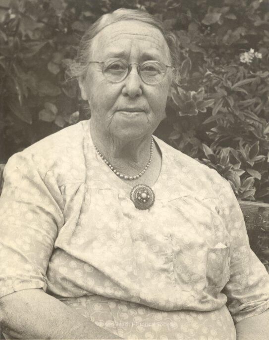 A black and white portrait of Mabel McKinnon. She is wearing glasses and looking full into the camera. She is in a print dress with a round brooch at the front and a necklace of beads or pearls. See notes.Collection
