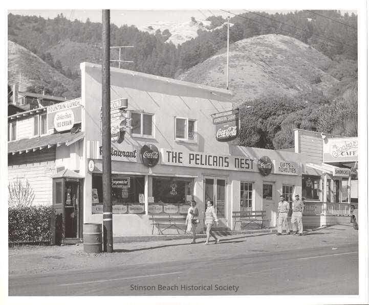 Black and white photo of a building (the Pelicans Nest) with a road in front and mountains in the background. There are signs on this restaurant and on the building next to it (the Breakers Cafe).