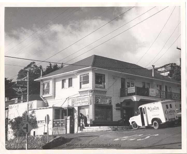 This black and white photograph of a building is Bill's Superette, originally Airey's hotel and then store, in downtown Stinson Beach. t is a large white, two storey building with bay windows at the two upper corners. There are signs over the two lower windows reading 'ED'S SUPERETTE' and in smaller print 'GROCERIES VEGETABLES MEATS BEER WINE'. There is a delivery truck from Clover Dairy parked in front.Collection