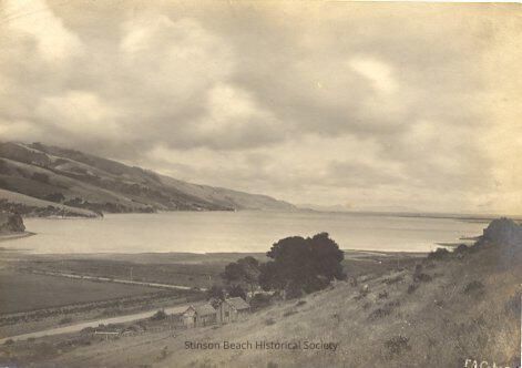 An original photograph taken by Edgar A. Cohen on 6/12/1903 of Bolinas Lagoon environs with hills rising along the lagoon. Junction of Olema-Bolinas Road and Fairfax-Bolinas Road with two ranch houses under trees ( probably, Steel Ranch) in foreground. Sky with clouds and Stinson sandspit jutting out on right mid-ground. Signed in white, E.A.Cohen on lower right corner. On the back: Photographs (stamped) #1612 - Bolinas Bay from Upper End (penciled) Edgar A. Cohen, Alameda Cal. (stamped)Collection