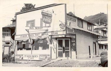 Black and white postcard of structure on Highway 1 downtown Stinson Beach. It is a wood building with multiple signs including Stinson Beach Post Office--Store, Bus Depot, Greyhound, Coca Cola, Fountain, and Lunch. There is a double door as entrance, possibly screen doors. A portion of the adjacent building to the north shows a stairway to the second floor, and behind the south side of the store some cottages on the hillside show. The store is also two stories with the letters "Mountain" showing behind the higher front.Collection