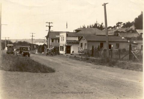A black and white picture of highway 1 looking toward Bolinas with 3 buildings (stores) on the right. There are cars parked on both sides of the unpaved road. Bolinas point is visible in the background.Collection