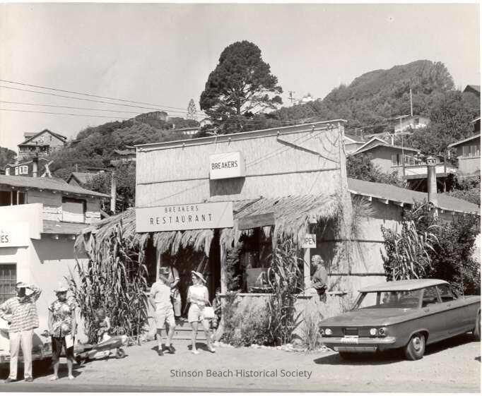 A black and white photograph of the front of Breakers Restaurant with unidentified people in front and on the porch and a car parked to the right of it. see notes.Collection