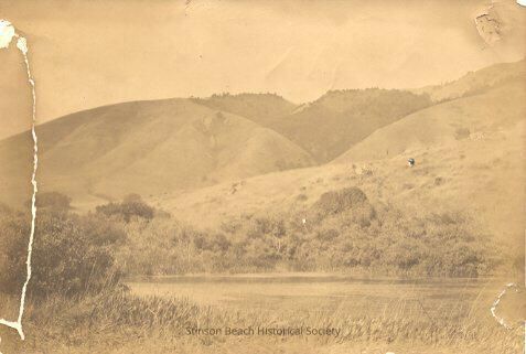 An original photograph by Edgar A. Cohen of Willow Camp Lake and Stinson Hills behind. A ranch fence in the middle of hills, now Highland area, or old Stinson Ranch. The lake is surrounded by trees and water grass. The photograph is torn, and in need of repair. On the back of photo: Photographs (stamped) #1882 Willow Camp Lake from Beach" (penciled) Edgar A. Cohen, Alameda, Cal. (stamped)Collection