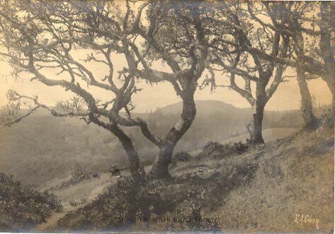 An original photograph by Edgar A. Cohen with his signature in white at lower right corner. It is a photograph taken on Dipsea (Lone Tree) trail. There are four oak trees along the trail and a lady is resting out in the sun. A hill going up ahead with a peak showing. Two of the trees have a posted sign attached though the sign is not readable. On its back: Photograph (stamped) #2140 - Resting on the Trail between Sequoia Canyon and Lone Tree (penciled) Edgar A. Cohen, Alameda, Cal.(stamped)Collection