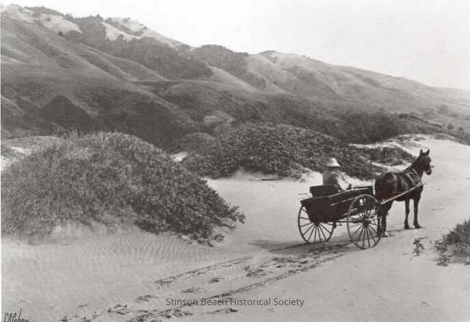 A 8x10 copy of the original photographic print by Edgar A. Cohen, signed in black on lower left. A horse and buggy with a lady driver in hat heading off to the right. Horse & buggy tracks show her path that has passed dunes covered with grass with the hills of Stinson in rising up on her left.Collection