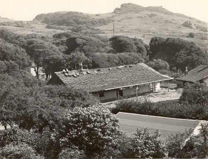 This is a black and white view of the Stinson Beach Community Center Building from above. The building is under construction and there are 4 workmen and some bundles of tiles on the roof.Collection
