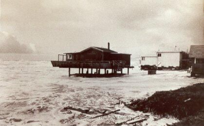 A black and white photograph of Von Kugelgan house (Lee and Nancy Von Kugelgan) , center, and Boyle house, white square house on right standing in stormy surf with debris in front taken during the storm of 1983 by Barrie Stebbings, local photographer who worked for the Coastal Post. Both houses were demolished.Collection