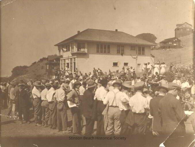 A photograph of unidentified people standing with their backs to the cameraman at the finish of the Dipsea race in front of the Airey Hotel. In the upper right hand corner going from left to right are Algar(De Camp) house and the Upton house.Collection