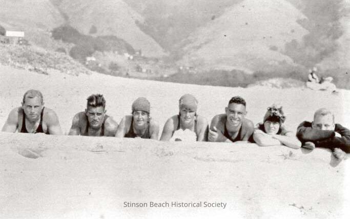 This is a photograph of the group who hung out at the Anchorage together. There are 7 people lying on the beach facing the camera. There is a log in front of them so only their heads and shoulders are visible. All are in bathing suits except for the man on the far right who is wearing a sweater. The hills and houses of Stinson Beach are behind them. From the left, unidentified/ Thompson, Earl/Thompson, Dorothy/Thompson, Margie/Cater, Scott/Thompson, Jean/Cooney, Joe.Collection
