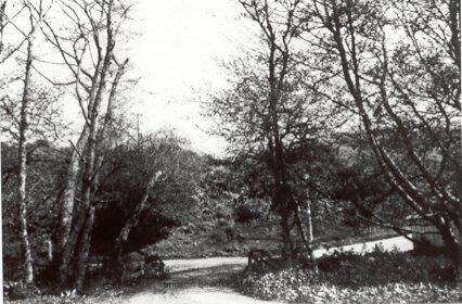 This black and white photograph shows a road branching off another road (Highway 1) across a wooden bridge (over Easkoot Creek). There are trees on either side of the bridge and a low hill (or sand dune?) behind Hy. 1.Collection