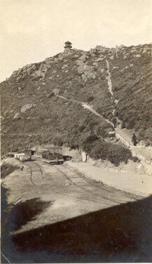 A black and white photograph showing 2 sets of tracks in the foreground with a car on each track. To the right of the tracks on the hillside is a pathway leading to a tower on the ridge above. A person is starting up the path. The lower portion of the path appears to be a constructed walkway of some sort. See notes.Collection
