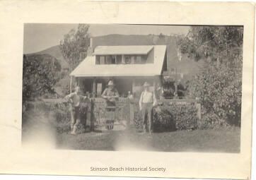 There is a 2-storey house in the center of this black and white photo, which is surrounded by plants and trees. There is a fence with a hedge in front of the house and a gate. Three adult men stand next to this fence, and there is a woman and 2 children behind the fence. All people are unidentified. The house (called Laffalot)is the Nielson house.Collection