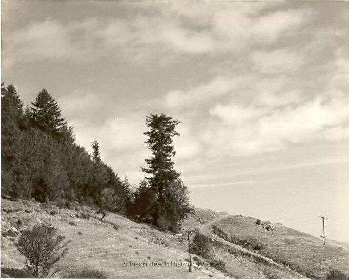This black and white photo depicts a hillside with a trail winding down beside a tall tree (Lone Tree) and the ocean in the background.Collection