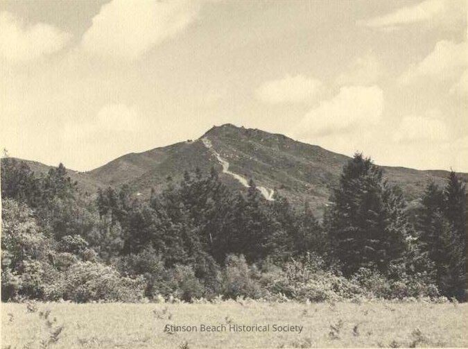 A photograph depicting Mount Tamalpais with the rail road grade (a fire trail) running from the top down to behind the trees in the middle ground. There is a grassy area in the foreground.Collection