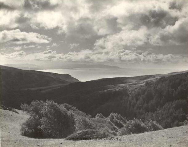 The photo depicts grassland and low shrubs in the foreground, dark hills in the middle ground and the ocean with the California coastline and clouds at the top.Collection