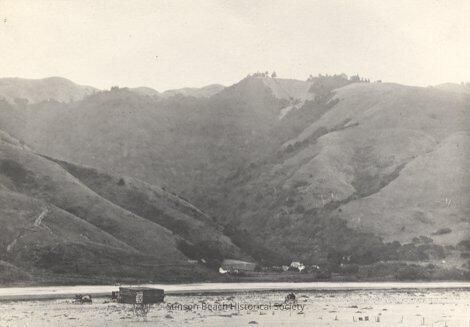 This black and white photograph shows coastal hills at the foot of which is a cluster of buildings (Stinson Ranch). The lagoon and shoreline stretch across the foreground. There is a shack or cabin on the shore abutting the lagoon. [See Notes]Collection