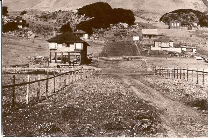 A black and white print of a fenced- in area in the foreground with a dirt lane approaching highway 1. A large two story building on the left (Airey's Hotel) faces the photographer with 8 front windows. A split rail fence closes off the field in the center going up the hill. Six other houses are up the hill with some small outbuildings. Two houses have been identified as the Morehead and DeCamp (Algar) houses. The high hills at the top of the print are barren and treeless. The small hill in the center of the picture has some trees, mostly around the houses. There is some rock outcropping.Collection